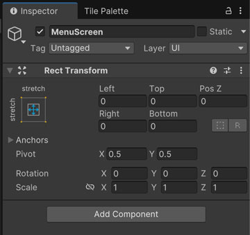 Inspectorウィンドウでは、アンカーの設定で [stretch – stretch] を選択し、縦横ともに引き伸ばして画面全体を覆うようにします。