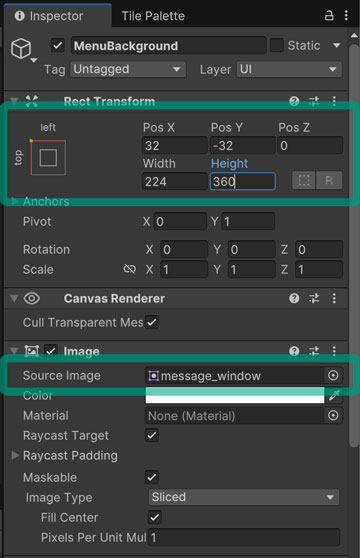 Inspectorウィンドウでは、「Rect Transform」のコンポーネントでアンカーを左上に、「Pos X」を [32] に、「Pos Y」を [-32] に設定します。また、「Width」を [224] に、「Height」を [360] に設定しましょう。「Image」のコンポーネントでは「Source Image」の項目で [message_window] の画像を設定します。